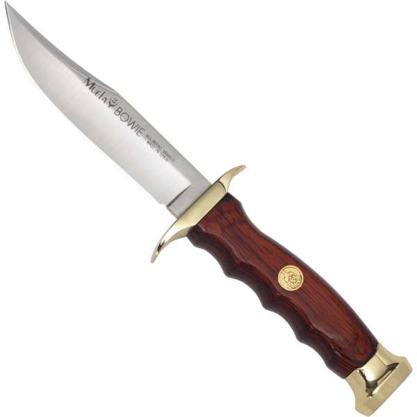 Das typische Muela Bowie Messer geht auf Arbeits- und Kampfmesser aus der Zeit des legendären Wilden Westens um 1800 zurück. Der Name stamm t von James Bowie, einem Pionier und Soldat in Texas. Er hat diese Messerform berühmt gemacht. Typisch sind eine entenschnabelförmige Klinge und eine kräftige, oftmals S-förmige Parierstange. Die Klinge aus rostfreiem Molybdän-Vanadium Stahl geht als Rundangel zum Griffende durch und ist dort verschraubt. Die Griffbeschalung ist aus Pakkaholz und hat ausgeprägte Fingermulden für eine gute Handlage, die Parierstange und der Endknauf sind aus Messing. Mit hochwertiger Lederscheide.Klingenlänge 100 mm Gesamtlänge 195 mm