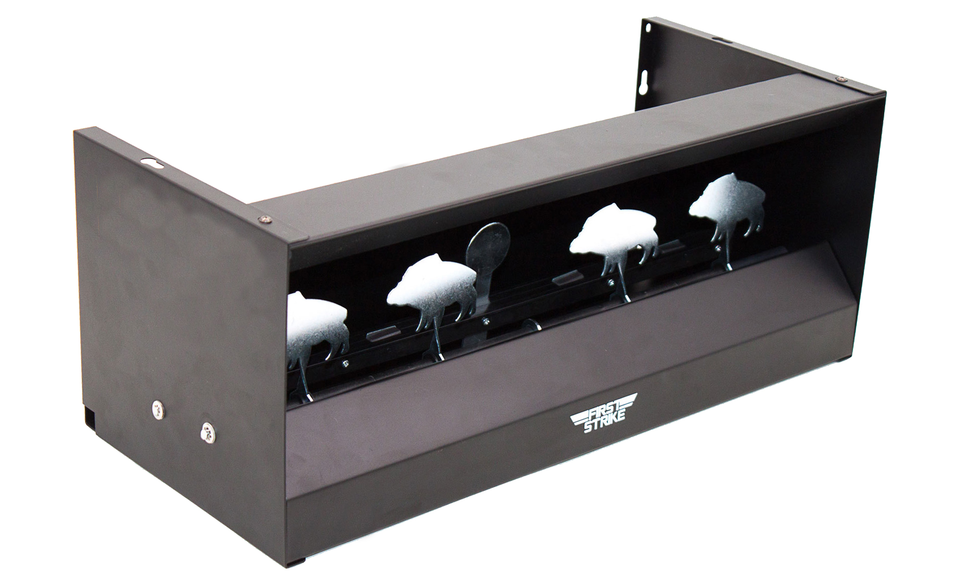 First Strike großer Zielkasten Wildschweine. Der Zielkasten ist für Luftgewehre und Luftpistolen bis 7,5 Joule geeignet. Der Wildschwein-Figuren Scheibenkasten hat vier Kippscheiben. Die vier Wildschwein Pendel müssen durch Treffer umgeworfen werden. Ein Treffer auf die mittlere Scheibe richtet die getroffenen Ziele automatisch wieder auf. Der Kasten kann an den Löcher auf der Rückseite oder den Löchern auf der Oberseite befestigt werden. (Siehe Fotos.)