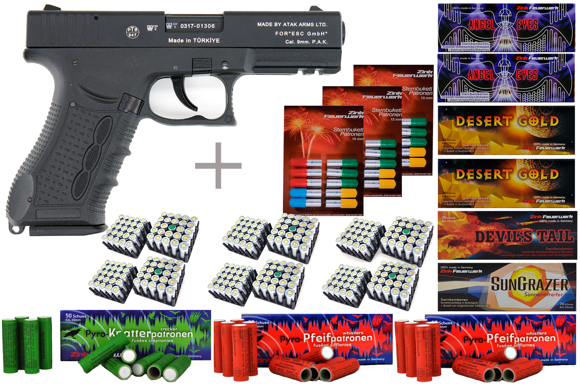 Für Silvester haben wir für Sie ein besonderes Set zusammgengestellt: Eine Schreckschusspistole Zoraki 917 im Kaliber 9 mm P.A.K. Schwarz/ brüniert mit 300 Schuss passenden 9 mm P.A.K Patronen und 300 Stück Effektmunition.Das Pyromunitions Set XXL besteht aus: 40 Stück Sternbombetten Desert Gold, ein eleganter Kometenaufstieg in Goldglitter und Bukett in leuchtendem Kontrastgrün 40 Stück Sternbombetten Angel Eyes, funkelnder Kometenaufstieg in Brokatgold und Bukett in hellweißen Blinksternen 20 Stück Sternbombetten Devil´s Tail, einen funkelnden Kometenaufstieg in Titansilber und ein zweistufiges Bukett von roten Sternen und Cracklingspitzen 20 Stück Sternbombetten Sungrazer, ein Kometenaufstieg in Brokagold plus Bukett von langziehender Silberweide 30 Stück Sternbukettpatronen in 4 Farben, Rot, Grün, Gelb und Blau. 50 Stück Pyro Knatterpatronen Cracker 100 Stück Pyro Pfeiffpatronen Whistlers Die Zoraki 917, im Kaliber 9mm P.A.K. brüniert, ist eine 17 schüssige Gaspistole / Signalpistole / Schreckschusspistole, sehr robust und zuverlässig, qualitativ sehr hochwertig! Allesfresser in punkto Platzpatronen. Die Gaspistole im Kaliber 9 mm P.A.K. ist ein Nachbau einer der bekanntesten Dienstwaffen, liegt gut in der Hand und eignet sich auch perfekt zum Selbstschutz. Im Setangebot bieten wir Ihnen eine vergünstigte Versandkostenpauschale von nur 9,99€* an, anstatt der 24,90* für den Versand von Gefahrgut. (Innerhalb Deutschland, andere auf Anfrage) Warnhinweise gem. CLP Verordnung (EG-VO-1272/2008): ACHTUNG: Explosive Stoffe/Gemische und Erzeugnisse mit Explosivstoff. Gefahr durch Feuer oder Splitter, Spreng- und Wurfstücke. Von Hitze, heißen Oberflächen, Funken, offenen Flammen und anderen Zündquellenarten fernhalten. Nicht rauchen.